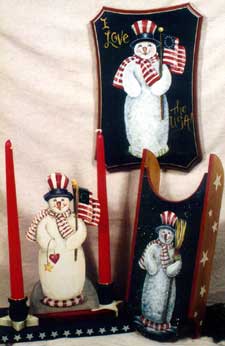 This one features two versions, one with a broom and the other holding a flag. A pattern for the interesting base for the candle holder is also included.